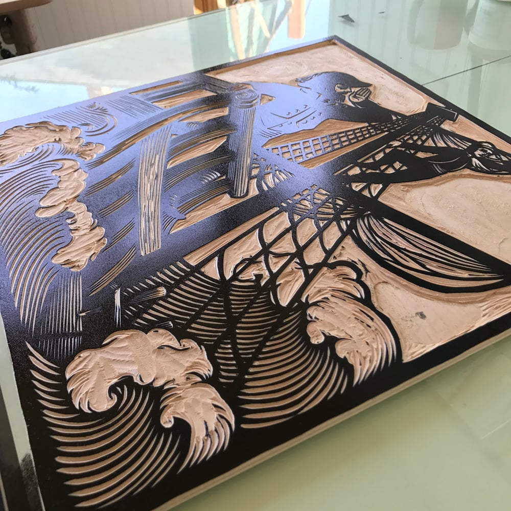 Originally created small scale, carved in linoleum as part of the album art, now I am carving and printing the Ballads in greater detail, from larger woodblocks.
